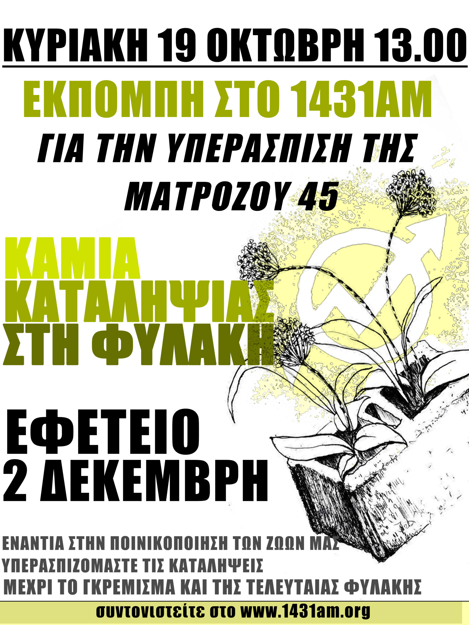 Στις 2 Δεκεμβρίου, στο Εφετείο Αθηνών, κρίνεται η φυλάκιση με 6,5 χρόνια στο πρωτόδικο, των συντροφιών που υπερασπίστηκαν την Ματρόζου 45. Καλούμε όλο τον Νοέμβριο σε πολύμορφες δράσεις αλληλεγγύης για να εμποδίσουμε την φυλάκιση των συντροφιών μας